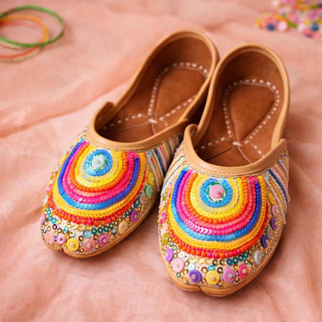 Each pair is carefully handmade by skilled artisans using intricate beadwork and embroidery techniques. The layered circular patterns and colorful embellishments are stitched with precision, making every jutti unique and full of character.